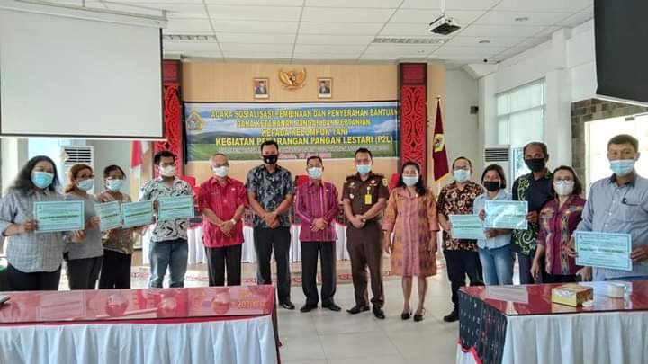 Sekaligus penyerahan Dana Bantuan Pemerintah kepada 7 kelompok Tani Penerima Manfaat kegiatan Pekarangan Pangan Lestari (P2L) DAK Non Fisik Tahun 2021. Sehingga dapat digunakan untuk sarana pembibitan, pengembangan demplot, pertanaman dan penanganan pasca panen.