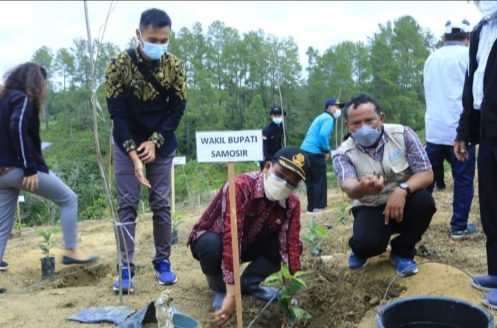 Samosir, POL | Bupati Samosir yang diwakili Sekdakab Samosir Drs. Jabiat Sagala, M. Hum menanam bibit kopi pada kegiatan penanaman perdana bibit kopi Program Dana Partisipatif Starbucks Farmer Support Center di Desa Sipira, Kecamatan Onanrunggu, Kamis (22/7/2021).
