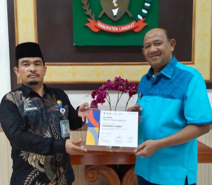 Langkat POL | Pelaksana Tugas (Plt) Bupati Langkat H.Syah Afandin SH Menerima Sertifikat Daerah Fokus Belajar dari Kementerian Pendidikan, Kebudayaan, Riset dan Teknologi (Kemendikbud ristek) RI melalui Co – Kapten Belajar.id Kabupaten Langkat oleh Kadis Pendidikan Kabupaten Langkat DR.H.Syaiful Abdi SH SE MPd, bertempat di Rumah Dinas Bupati Langkat, Kamis (11/5/2023).