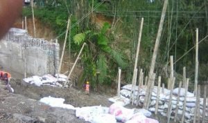 Terlihat dalam foto bahwa tembok penahan sebelah barat dengan beton, sementara sebelah Timur goni disusun dan terpancang bambu. (POL/lsg)