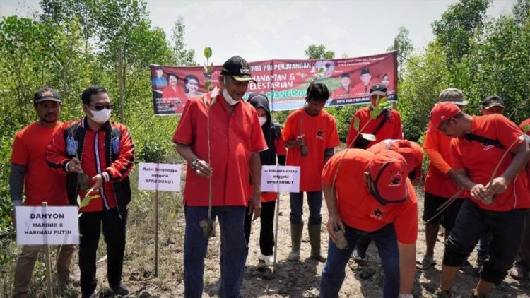 Langkat, POL | Dewan Pimpinan Cabang (DPC) Partai Demokrasi Indonesia Perjuangan (PDIP) Kabupaten Langkat melaksanakan penanaman dan pelestarian hutan mangrove, di Desa Lubuk Kertang Kecamatan Brandan Barat, Langkat, Minggu (23/1/2022).