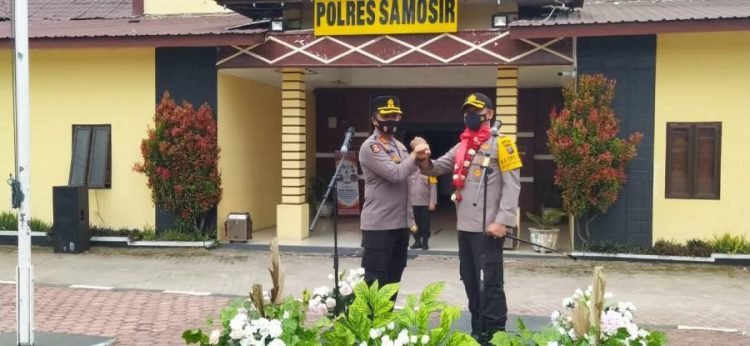 Samosir, POL | Kepolisian Resort (Polres) Samosir menggelar upacara pisah sambut Kapolres dari AKBP Muhammad Saleh S.I.K M.M kepada AKBP Josua Tampubolon SH. MH. di halaman Mapolres Samosir, Jalan Sisingamangaraja Kabupaten Samosir, Jumat (8/1/2021).