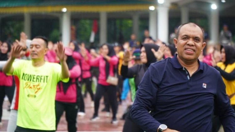 Stabat, POL | Pj. Bupati Langkat, H.M. Faisal Hasrimy, AP, M.AP., bersama Wakapolda Sumatera Utara Brigjen Pol Rony Samtana, S.I.K., M.T.C.P., beserta istri Martina Rony Samtana, memimpin acara Power Fit Party Langkat yang diselenggarakan di Alun-alun T. Amir Hamzah, Stabat, pada Minggu (6/10/2024).