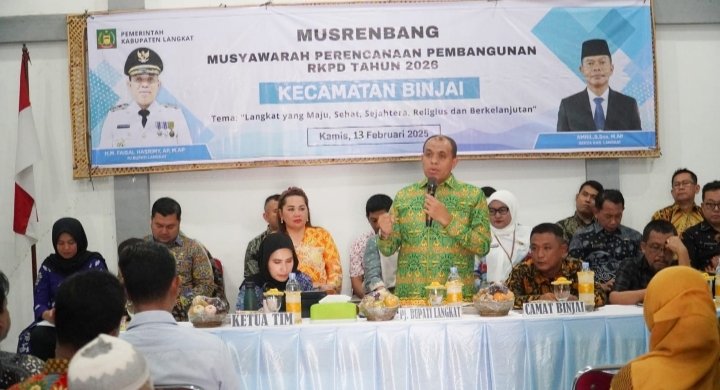 Stabat, POL | Pj. Bupati Langkat, H.M. Faisal Hasrimy, AP, M.AP, secara resmi membuka Musyawarah Perencanaan Pembangunan (Musrenbang) Kecamatan Binjai dalam rangka penyusunan Rencana Kerja Pemerintah Daerah (RKPD) Tahun 2026. Kegiatan yang berlangsung di Kantor Kecamatan Binjai pada Kamis (13/2/2025) ini bertujuan menyelaraskan dan mengoptimalkan perencanaan pembangunan dengan melibatkan partisipasi masyarakat.