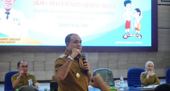 Stabat, POL | Pj. Bupati Langkat, Muhammad Faisal Hasrimy, AP, M.AP, memimpin Rapat Evaluasi Intervensi Serentak Percepatan Penurunan Stunting Kabupaten Langkat Tahun 2024, yang diadakan di Ruang Pola Kantor Bupati Langkat pada Senin (15/07/2024).
