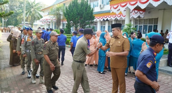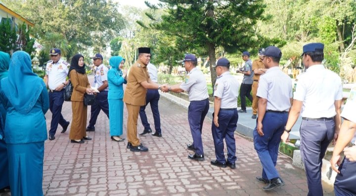 Pj. Bupati Langkat H.M. Faisal Hasrimy, AP, M.AP, berpamitan kepada seluruh jajaran Pemerintah Kabupaten Langkat dalam apel gabungan yang digelar di halaman Kantor Bupati Langkat pada Senin, 10 Februari 2025.