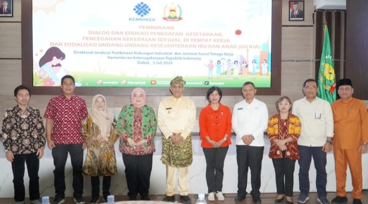 Stabat, POL | Pj Bupati Langkat Menghadiri Dialog Edukasi Penerapan Kesetaraan Pencegahan Kekerasan Seksual di Tempat Kerja dan Sosialisasi Undang-undang Kesejahteraan Ibu dan Anak (UUKIA) yang diadakan oleh Kementerian Ketenagakerjaan (Kemnaker RI ) yang di laksanakan di Ruang Pola Kantor Bupati Langkat Stabat, Jum’at (5/7/2024)