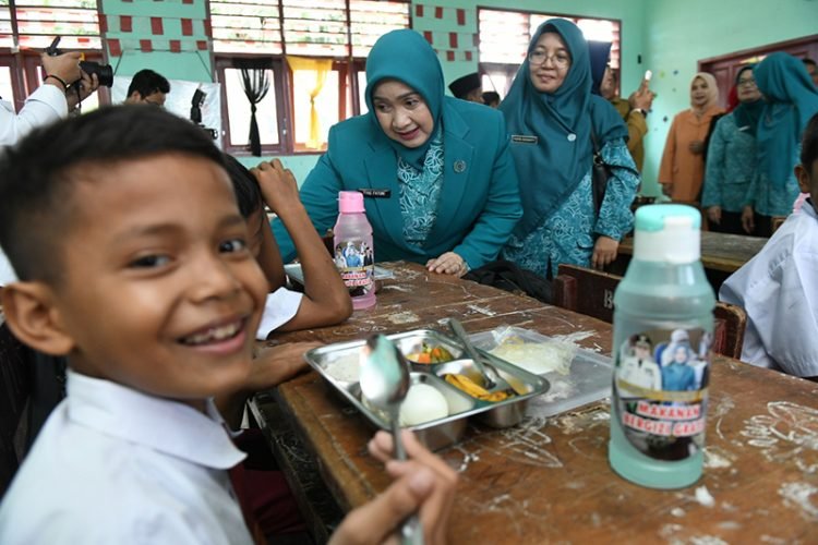 Langkat, POL | Penjabat (Pj) Ketua Tim Penggerak Pemberdayaan Kesejahteraan Keluarga (TP PKK) Sumatera Utara (Sumut) Tyas Fatoni mengapresiasi launching Program Makan Sehat Bergizi Gratis bagi anak-anak sekolah di Kabupaten Langkat. Kegiatan tersebut dilaksanakan di SDN 056616 Desa Suka Mulia, Kecamatan Secanggang, Kabupaten Langkat, Sumut, Senin (16/1/2024).