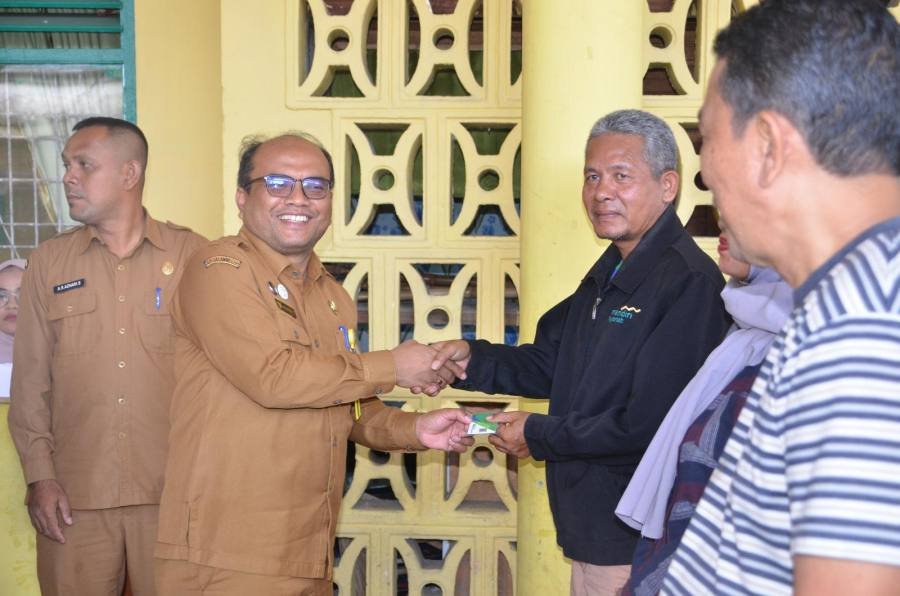 Padangsidimpuan, POL | Pj. Wali Kota Padangsidimpuan, Dr. H. Letnan Dalimunthe, S.K.M, M.Kes, menyerahkan Kartu BPJS Ketenagakerjaan pada Masyarakat penerima bantuan iuran pekerja bukan penerima upah, yang dilaksanakan di aula Kantor Camat Padangsidimpuan Selatan, Senin (12/02/2024).