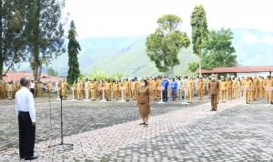 Samosir, POL | Pejabat Sementara (Pjs) Bupati Samosir Lasro Marbun memimpin apel gabungan perdana yang diikuti oleh jajaran pegawai di lingkungan Pemerintah Kabupaten Samosir.