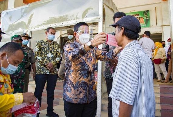 Labuhanbatu, POL | Pejabatj sementara Bupati Labuhanbatu Drs Mhd Fitryus SH,MSP didampingi para Asisten, sejumlah kepala OPD, Camat Rantau Utara, Bhabinsa dan Bhabinkamtibmas melakukan sidak protokol kesehatan (Prokes) terhadap masyarakat Rantau Utara yang berada di lokasi pasar gelugur, Kamis (5/11/2020).