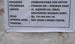 Dalam gambar yang dikirimkan Lurah terlihat sebuah plang proyek terbuat dari baliho terpasang pada salah satu tembok (dinding beton, red) yang berisikan informasi mengenai nama kegiatan, pelaksana kegiatan, lokasi kegiatan, nilai / jumlah anggaran dan sumber dana kegiatan. Dari baliho tersebut diketahui bahwa jumlah dana yang dianggarkan untuk kegiatan pembangunan cor beton gang emas itu menelan biaya sebesar Rp 130 juta.