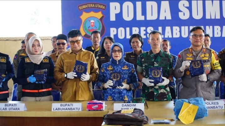 Kegiatan dilanjutkan dengan Pemusnahan Barang Bukti oleh Forkopimda Kabupaten Labuhanbatu, Bupati Labuhanbatu Utara, Ketua PWI Labuhanbatu, Puslabfor Polda Sumut, dan tokoh masyarakat. (LB1)