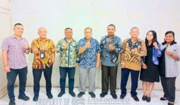 Plt Kadis Kominfo didampingi Kepala Bidang Teknologi Informasi Ulfian Hamdani MAP dan staf bidang TI, menerima kedatangan Analis Persandian Diskominfo Provsu Donal F Nainggolan SKom MSi bersama Dedi Ferianto Sianipar SKom dan Heri Wahyudi AMd.