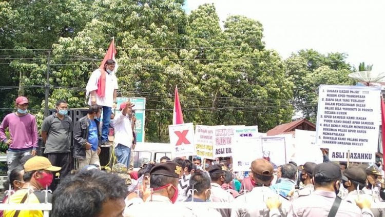 Samosir(, POL | Ratusan massa yang tergabung dalam Aliansi Pemuda dan Masyarakat Peduli Demokrasi (APMPD) Samosir unjuk rasa ke Kantor KPU dan Bawaslu Samosir, Kamis (17/9/2020 ).