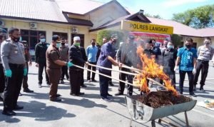 Langkat, POL | Kepolisian Resort (Polres) Langkat musnahkan barang bukti tindak pidana narkotika jenis ganja dengan dibakar, berlangsung dihalaman Jananuraga Mapolres Langkat, Stabat, Kamis (10/9/2020) pagi.