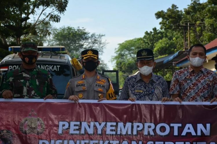 Langkat, POL | Polres Langkat kembali melakukan penyemprotan disinfektan disejumlah lokasi dan fasilitas umum, Jumat (16/7/2021).