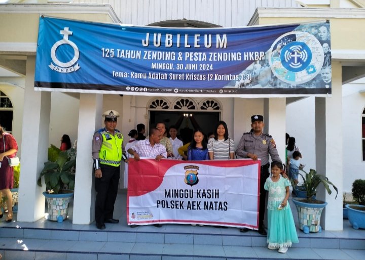 Rantauprapat, POL | Plt. Kapolsek Aek Natas Iptu D.P Tarigan beserta personil Polsek Aek Natas melaksanakan kegiatan “Minggu Kasih” di halaman Gereja HKBP Aek Natas, Kecamatan Aek Natas, Kabupaten Labuhanbatu Utara, Minggu (23/06/2024).