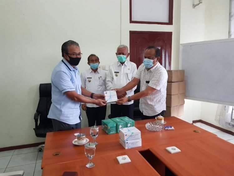 Serah terima bantuan rapid tes sebanyak 250 pcs ditambah peralatan lain berupa masker 5.200 lembar diterima langsung oleh Kadis Kesehatan, Juliwan Hutapea disaksikan Wabup Hulman Sitorus, Kabag Ekon Eston Sihotang, Kabag Tapem Lahsa Manullang, Manajer Humas PT BDSN Zeprin Alam Harahap dan Maruli Simanjuntak. (POL/Tb.3)