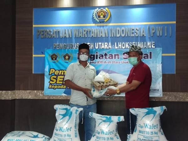 Lhokseumawe, POL | Sebagai bentuk upaya untuk mengantisipasi dampak sosial dan ekonomi akibat wabah Corona Virus Disease (Covid-19), Pengurus Persatuan Wartawan Indonesia (PWI) bersama Ikatan Keluarga Wartawan Indonesia (IKWI) Aceh Utara Lhokseumawe, membagikan paket sembako untuk wartawan anggota organisasi pers tersebut.
