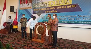Rapat Kerja DPRD Kota Medan Tahun 2021 yang bertema “Bangkit Bersinergi dalam Kolaborasi Mewujudkan Kota Medan yang Berkah, Maju dan Kondusif” ini berlangsung dari tanggal 7-9 November 2021.(POL/isvan)