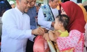 Rantauprapat, POL | Bupati Labuhanbatu H Andi Suhaimi Dalimunthe membagikan 180 paket sembako kepada masyarakat di lingkungan Aek Matio Kelurahan Sirandorung Rantau Utara, Jum’at (17/4/2020) seusai Sholat Jum’at, di daerah itu.