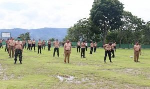 Selain berjemur juga dilaksanakan senam bersama yang dipandu salah seorang anggota Kodim 0210/TU.