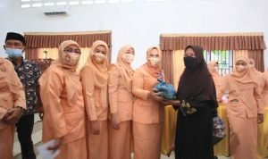 Langkat, POL | Dharma Wanita Persatuan (DWP) Kabupaten Langkat menggelar bakti sosial dengan membagikan ribuan masker dan 30 paket sembako kepada kaum dhuafa ditiga wilayah Kabupaten Langkat, dalam rangka menyambut HUT ke 21 DWP Kabupaten Langkat tahun 2020.