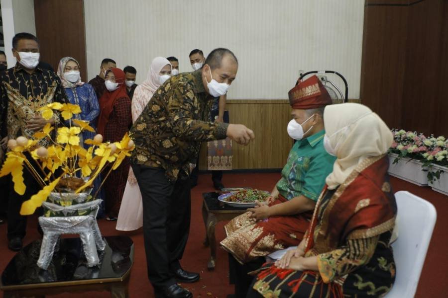Secara bergantian Bupati H. Surya BSc beserta istri, Wakil Bupati Taufik Zainal Abidin besrta istri, dan unsur Forkopimda lainnya mengupah – upah dan menyarungkan kain kepada Danlantamal I Belawan Laksamana Pertama TNI Achmad Wibisono SE, CHRMP.