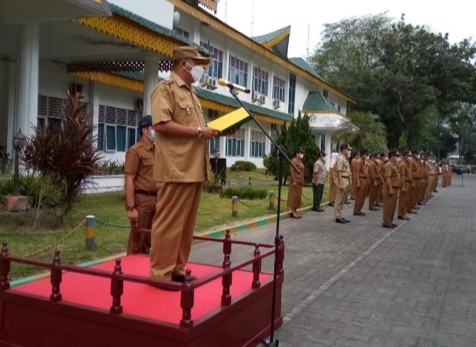 Langkat, POL | Bupati Langkat Terbit Rencana PA melalui Wakil Bupati Langkat H.Syah Affandin memimpin apel gabungan ASN dijajaran Pemkab Langkat, di Halaman Kantor Bupati Langkat, Stabat, Senin (26/7/2021).