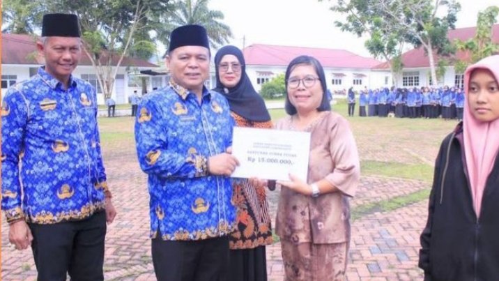 Sekdakab Labuhanbatu Hasan Heri Rambe saat membacakan amanat Ketua Umum Dewan Pengurus Korpri Nasional, antara lain yang berisi mengajak Pengurus Korpri agar turut berperan serta secara aktif dalam menangani masalah Inflasi, stunting, kemiskinan ekstrim, anak tidak sekolah, dan perkawinan anak-anak.