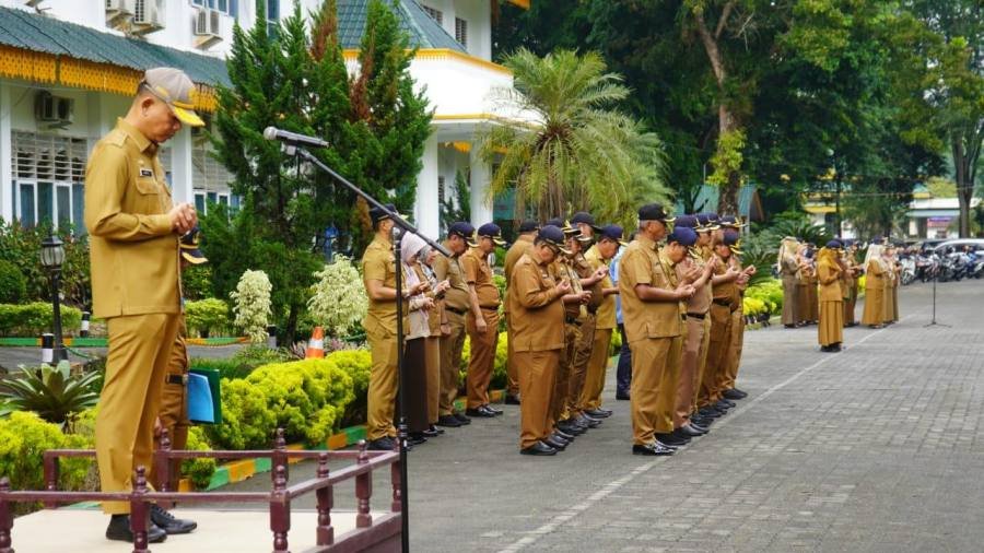 Stabat, POL | Pj Bupati Langkat H.M.Faisal Hasrimy AP,M.AP diwakili oleh Sekretaris Daerah (Sekda) H.Amril,S.Sos,M.AP Menjadi Pemimpin Apel Gabungan Aparatur Sipil Negara (ASN) Pemerintah Kabupaten Langkat di Halaman Kantor Bupati Langkat, Senin (1/7/2024) pagi.