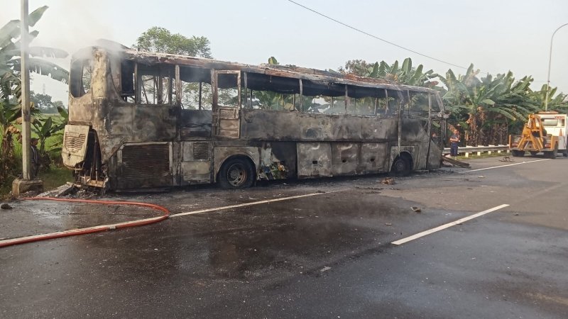 Diduga untuk menghindari kecelakaan, arah bus terlalu mengambil jalur kiri sehingga bergesakan dengan pembatas jalan (Gadriel), dan menimbulkan percikan api. Diduga percikan api, menyambar tangki minyak bus, mengakibatkan terbakar.