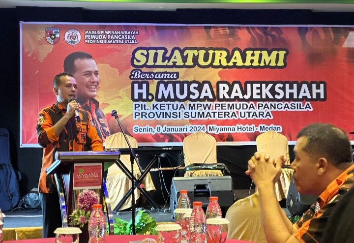 Medan POL | Plt Ketua MPW Pemuda Pancasila Provinsi Sumatera Utara H.Musa Rajekshah, Silaturahmi bersama seluruh pengurus MPW Pemuda Pancasila Provinsi Sumatera Utara, Miyana Hotel Medan, Senin (8/1/2024).