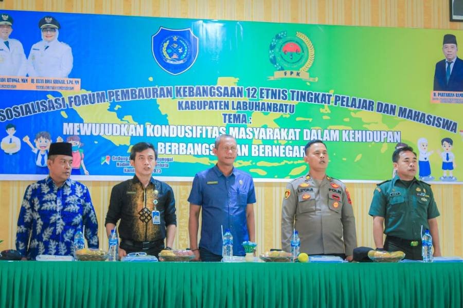 Labuhanbatu, POL | Mewakili Bupati Labuhanbatu dr. H. Erik Adtrada Ritonga, MKM Asisten I Pemerintahan dan Kesra Setdakab Labuhanbatu H. Sarimpunan Ritonga, M.Pd hadiri kegiatan sosialisasi Forum Pembauran Kebangsaan (FPK) 12 Etnis Kabupaten Labuhanbatu di Gedung Abdi Karya Manunggal, Komplek Kodim 0209/LB, Jalan Pramuka, Kelurahan Padang Matinggi, Kecamatan Rantau Utara, Kamis (27/07/2023).