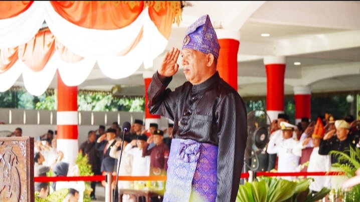 Tampil mengenakan pakaian adat Melayu, Bupati Syah Afandin menambah kesakralan suasana upacara yang diikuti ribuan peserta dari unsur TNI, Polri, ASN, pelajar, hingga organisasi kemasyarakatan.