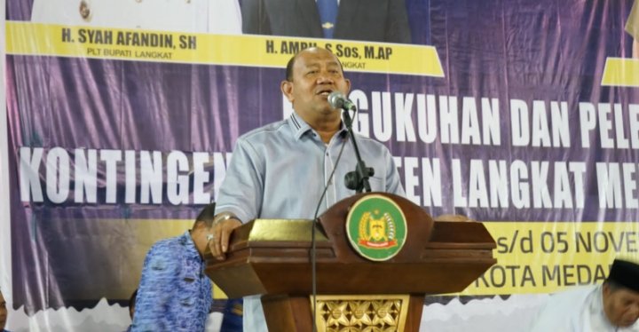 Langkat, POL | Pelaksana Tugas (Plt) Bupati Langkat H Syah Afandin SH mengukuhkan dan melepas Kontingen Pekan Olahraga Provinsi Sumatera Utara (Porprovsu) Kabupaten Langkat, di Gedung Serbaguna (GOR) Stabat, Stabat, Jum’at (28/10/2022).