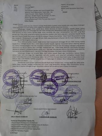 “Sehubungan dengan hal itu, kami memohon kiranya Bapak Camat memberikan batasan waktu sampai kapan kami menunggu dan bagaimana hasil akhir jawaban surat yang kami sampaikan kepada Bapak terkait keberadaan perusahaan perkebunan, dalam hal ini PT. PHS yang menggunakan tanah wilayah adat Luat Pinarik Papaso yang berlokasi lingkungan delapan desa sebagaimana tersebut pada prihal pokok surat tertanggal 16 Juni 2020 ini,” tulis para kades dalam surat mereka.