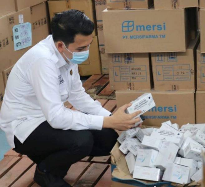 Sei Rampah, POL | Ketua DPRD Sergai dr.M Riski Ramadhan Hasibuan sangat terkejut melihat banyak obat-obatan yang hampir kedaluarsa di dalam gedung UPT Instalasi Farmasi Dinas Kesehatan Serdang Bedagai (Dinkes Sergai) saat meninjau hasil persiapan bangunan Gedung Farmasi di lingkungan Perkantoran Bupati Sergai di Sei Rampah, Rabu (20/1/2021).