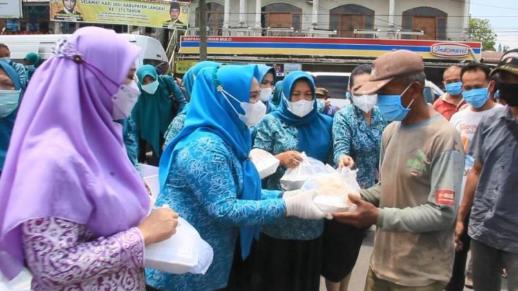 Langkat, POL | Tim Penggerak PKK  dan Dharma Wanita Persatuan (DWP) Kabupaten Langkat menggelar aksi sosial, bagi-bagi nasi nasi berkah (bungkus gratis) kepada warga yang membutuhkan di beberapa titik di Kecamatan Kuala, Jumat (19/3/2021).