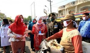 Diketahui, ketua PKK Langkat, membagikan masker kepada pengguna jalan Simpang Durian Mulo dan objek wisata Alam Bar Bar Sari Kecamatan Kuala.