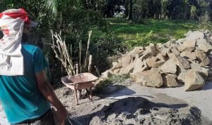 Sejumlah pekerja terlihat sibuk melakukan pembuatan tembok penahan yang berlokasi di dua titik pada ruas Jalan Provinsi jurusan Pulau Rakyat-Porsea,tepatnya di depan ramp sawit PT Pastima dan di Aek Merah,Desa Marjanji Aceh,Kecamatan Aek Songsongan,Asahan,Jum’at (20/11/2020).