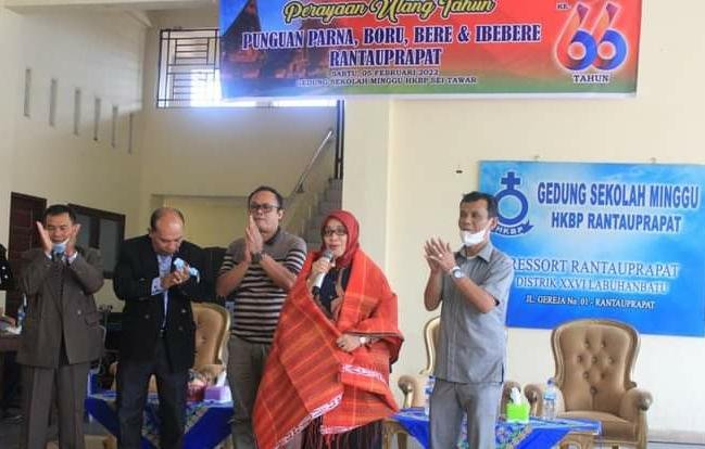 Wakil Bupati Labuhanbatu mengucapkan selamat ulang tahun yang ke-66 tahun Punguan Parna, Boru, Bere dan Ibebere yang digelar di Gedung Sekolah Minggu HKBP Jalan Sei Tawar. Wabup juga menyampaikan permohonan maaf, karena Bupati Labuhanbatu dr Erik Adtrada Ritonga yang tidak bisa hadir.
