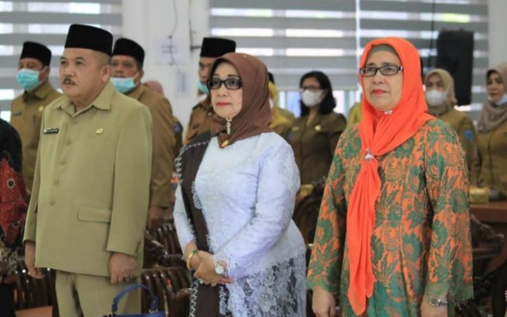 Labuhanbatu, POL | Waki Bupati Labuhanbatu Hj. Ellya Rosa Siregar, S.Pd., MM bersama Sekdakab Labuhanbatu dan para OPD Labuhanbau, menghadiri dan mengikuti Upacara Peringatan Hari Lahir Pancasila serentak melalui secara Daring di Ruang Data dan Karya, Kantor Bupati Labuhanbatu Jalan SM Raja Ujung Banadar Kecamaan Rantau Selatan, Rabu (01/06/2022).