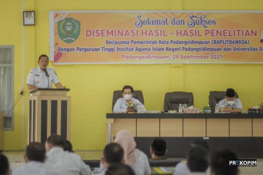 Padangsidimpuan, POL | Wali Kota Padangsidimpuan Irsan Efendi Nasution membuka acara diseminasi hasil-hasil penelitian kerja sama Pemerintah Kota Padangsidimpuan dengan Perguruan Tinggi, Rabu (29/9/2021) di Aula BKPDSDM Palopat Pijorkoling Padangsidimpuan.