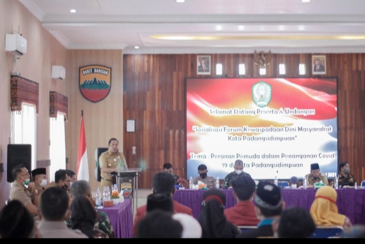 Padangsidimpuan, POL | Walikota Padangsidimpuan Irsan Efendi Nasution membuka sosialisasi Forum Kewaspadaan Dini Masyarakat Kota Padangsidimpuan, Selasa (8/6) Pukul 09.00 WIB di Aula Daulay Simorangkir Makodim 0212/TS.