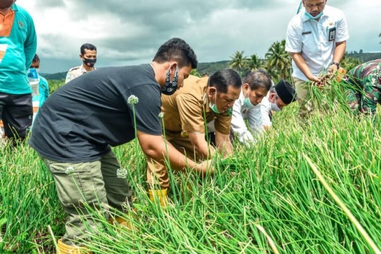 Padangsidimpuan, POL | Wali Kota Padangsidimpuan Irsan Efendi Nasution SH,bersama Kelompok Tani Simangornop Panen Bawang Merah hasil Penangkaaran di Desa Mompang Kecamatan Padangsidimpuan Angkola Julu, Rabu (25/11/2020).