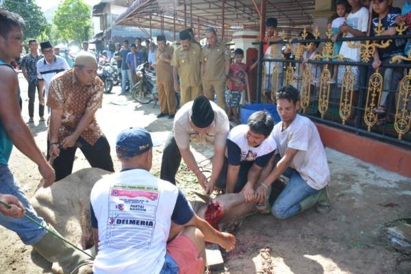 Sibolga, POL | Pada pelaksanaan Ibadah Qurban tahun 1440 H/2019 M, Wali Kota Sibolga Drs. H.M Syarfii Hutauruk, MM, bersama Ketua Tim Penggerak Pemberdayaan Kesejahteraan Keluarga (TP. PKK) Kota Sibolga Dra. Hj. Delmeria Harun Sikumbang, berqurban sebanyak 2 (dua) ekor kerbau bersama Dewan Pimpinan Pusat Himpunan Kerukunan Keluarga Barus (DPP. HIKKBAR).