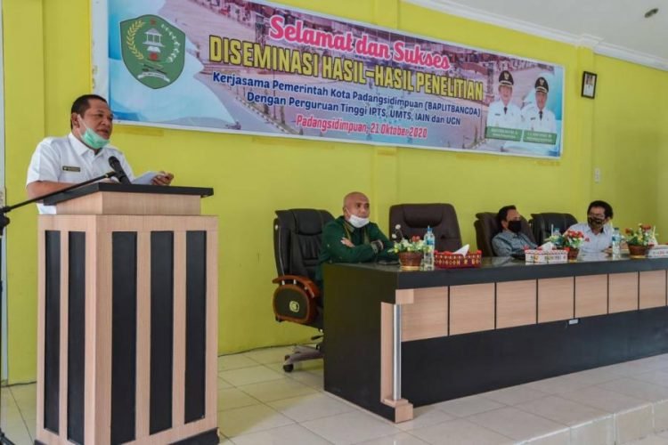 Padangsidimpuan, POL | Walikota Padangsidimpuan Irsan Efendi Nasution SH,membuka acara Diseminasi hasil-hasil penelitian kerja sama Pemerintah Kota Padangsidimpuan (Baplitbangda) dengan perguruan tinggi IPTS, UMTS, IAIN, dan UGN di Aula BKPSDM, Komplek Perkantoran Palopat Pijorkoling, Padangsidimpuan Tenggara, Rabu (21/10/2020).