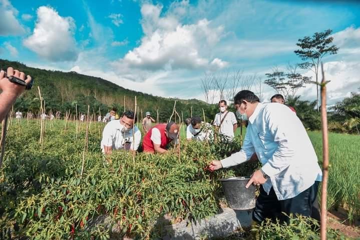 Padangsidimpuan, POL | Walikota Padangsidimpuan Irsan efendi Nasution panen raya cabai merah hasil tanaman Kelompok Tani (Koptan) Mekar, di Desa Bargot Topong, Kecamatan Padangsidimpuan Batunadua, kemarin.